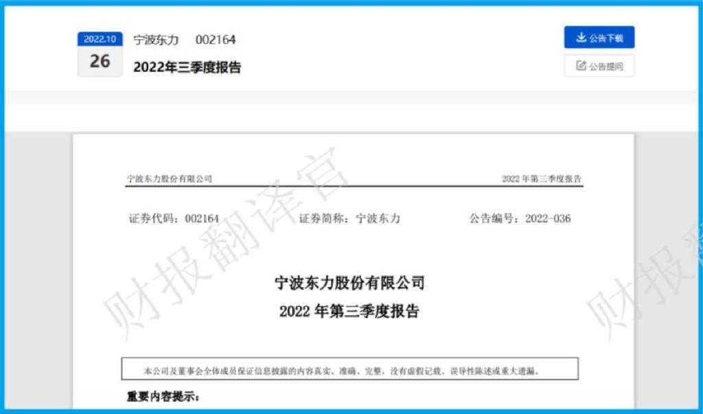 大家好我是财报翻译官,今天将调研A股通用机械概念板块中,宁波动力(股票代码:002164)这家上市企业2022年第三季度财报,下面进入今天的主题。