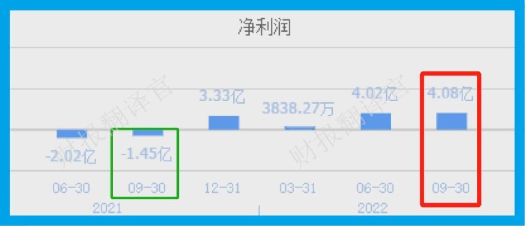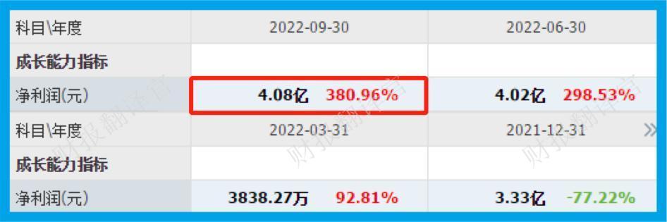 2021年第三季度,这家企业的净利润为-1.45亿元。到了2022年第三季度,公司的净利润就达到了4.08亿元,同比大幅增长了381%。
