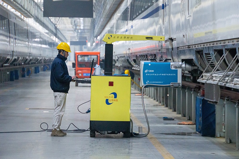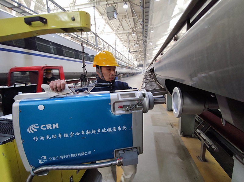 除夕当天,动车组机械师正在进行动车组空心车轴探伤作业。王子俊 摄