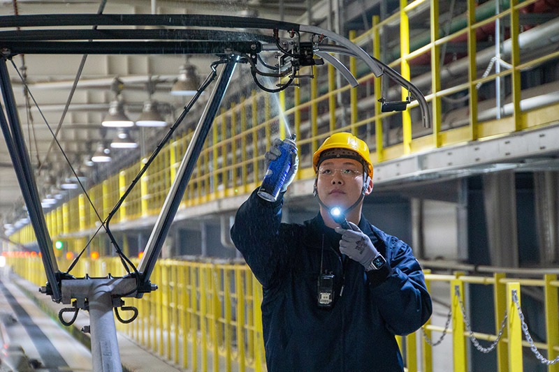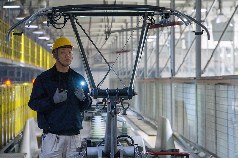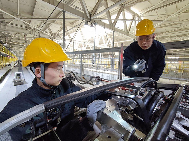 除夕当天,动车组机械师正在进行动车组受电弓动态检查。王子俊 摄