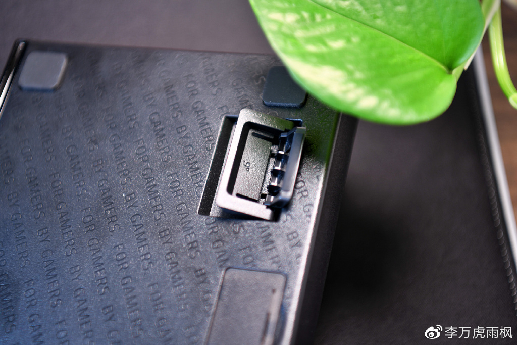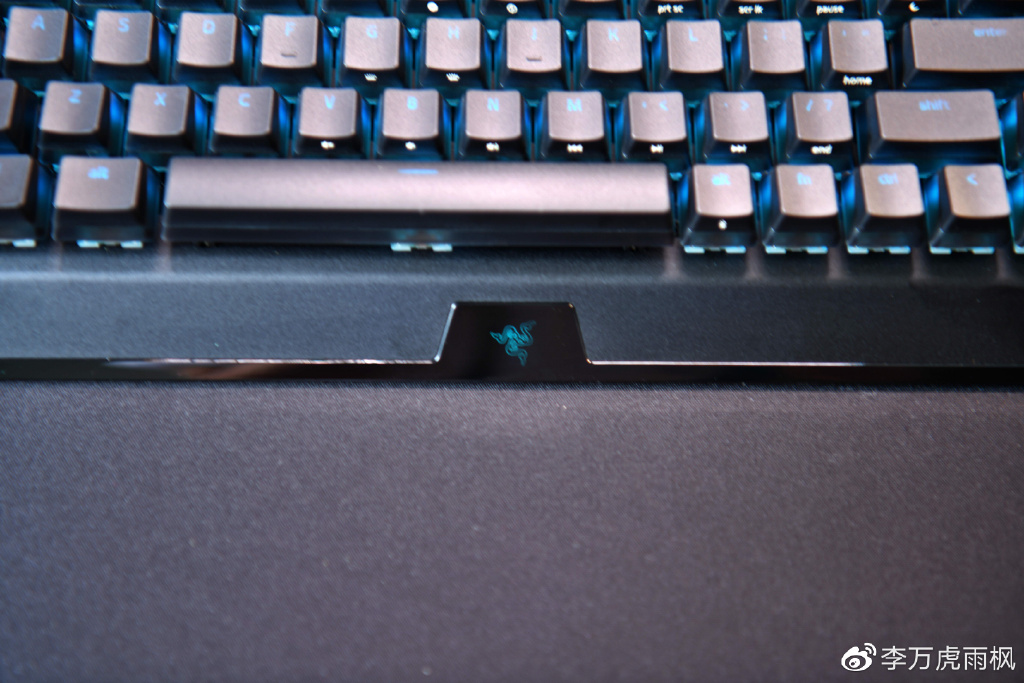 靠近手腕的部分,专门设计了一个小屏幕上面印制了雷蛇的logo,灯光点亮之后确实挺漂亮。