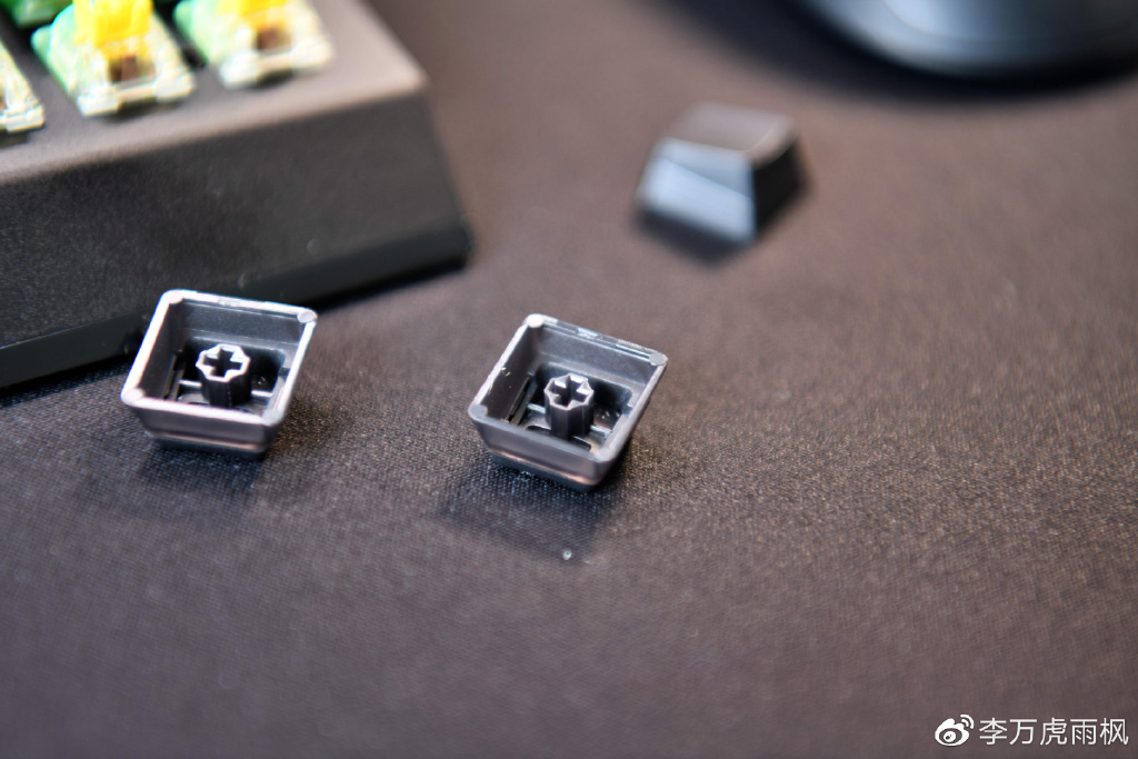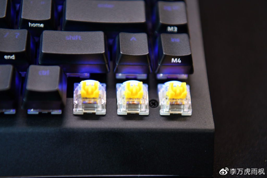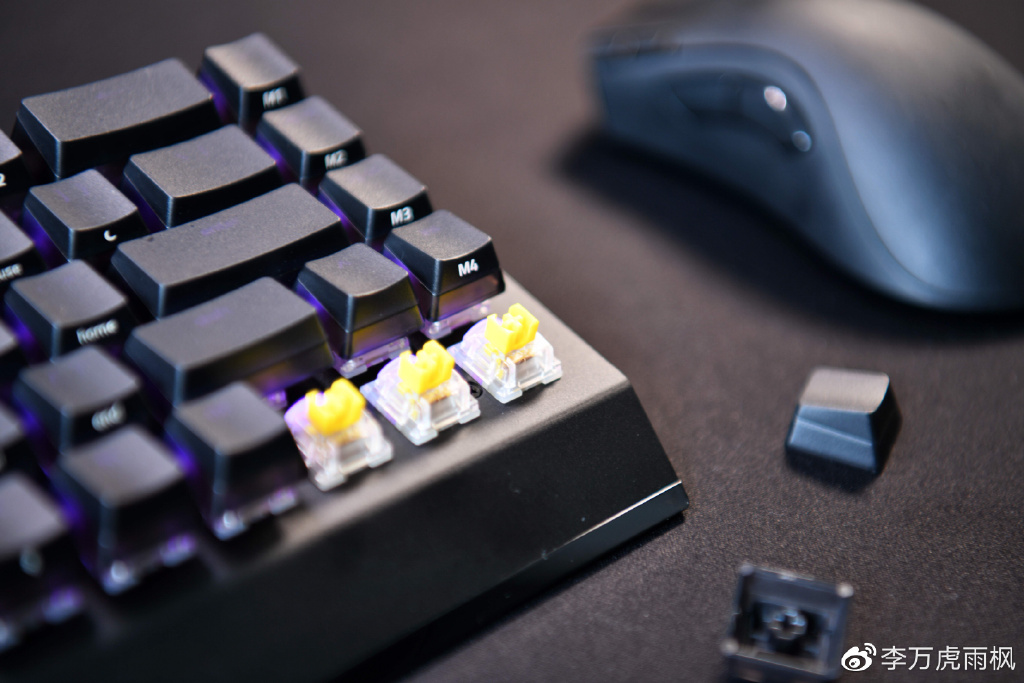 在轴体的选择方面,我尝试了雷蛇的黄轴,黄轴作为一款流畅线性轴保证手感的同时,有着3.5㎜的总行程、1.2㎜的触发行程以及45g的触发压力,按键寿命高达8000万次。