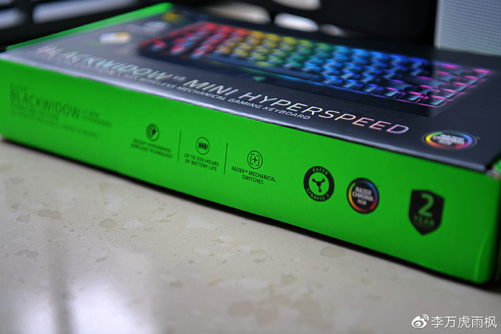 作为典型灯厂的雷蛇,其实我蛮喜欢他们家的主题色,尤其是实物其实更漂亮,包装盒的侧面也可以看出支持雷云软件的设置以及产品固件更新、具有RGB灯效等核心功能。