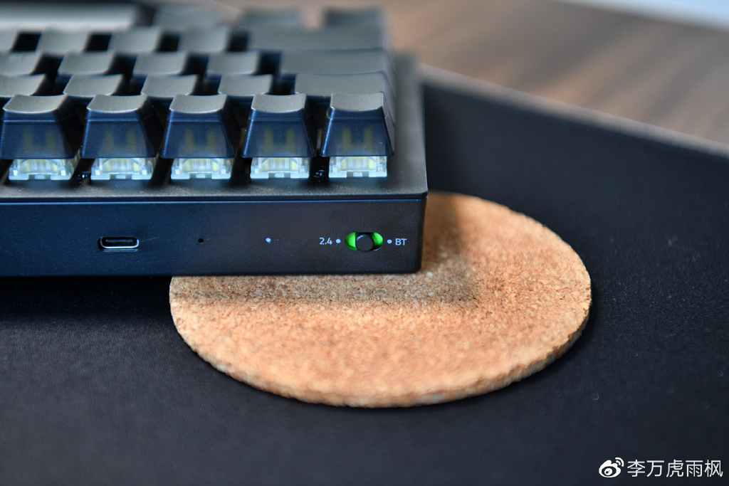 在连接方面,支持有线、蓝牙以及2.4G三种连接方式,由于采用了雷蛇HYPERSPEED无线技术,比一般的无线技术提升25%,有着更高的数据传输和更低的点击延迟,尤其是游戏时可以带来超越有线键盘的稳定性和响应速度。