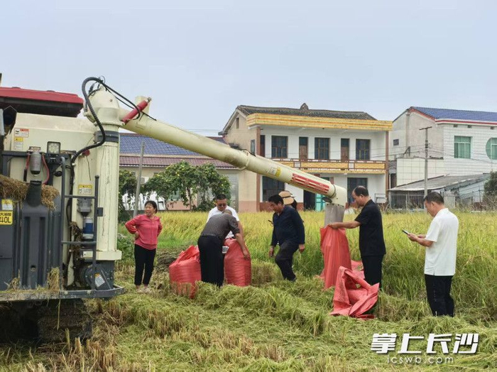 近日,宁乡市双江口镇的“宁乡香米”千亩示范片开展测产工作。测产现场,收割机轰鸣穿梭,专家组则同步开展面积丈量、鲜谷称重、水分检测等工作,整套流程完成后,当场核算出亩产数据。