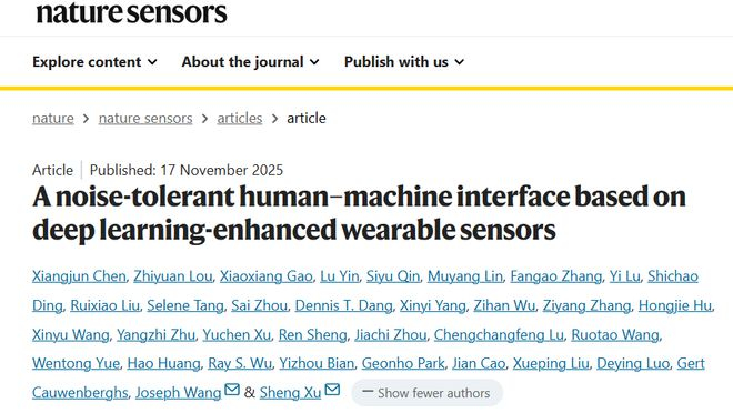 近日,相关论文以《一种基于深度学习增强型可穿戴传感器的抗运动伪影人机交互界面》(A noise-tolerant human–machine interface based on deep learning-enhanced wearable sensors)为题发表在 Nature Sensors[1]。