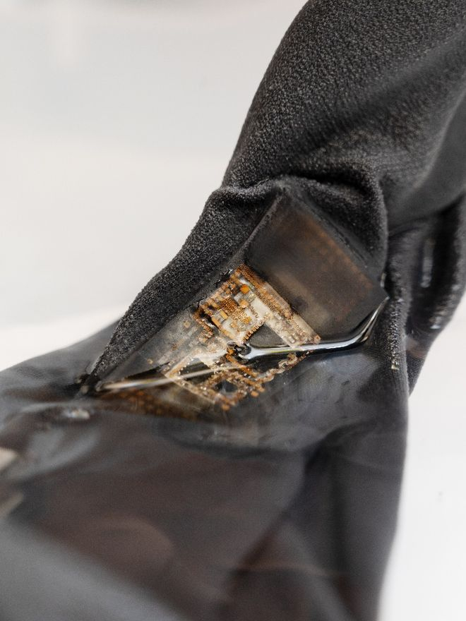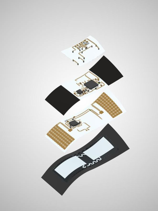 采用柔性电池的优势在于,与器件同等尺寸且整个器件是完全集成的,并且研究团队有一整套制备工艺让器件和电池都能够从硬态变为具有 20% 可拉伸性的状态,能够舒适贴附于用户前臂,并能持续供电 4 小时以上。此外,设备的蓝牙信号强度在 20 m 范围内保持稳定,即使在弯曲和拉伸状态下,电池容量也能维持在约 25 mAh。