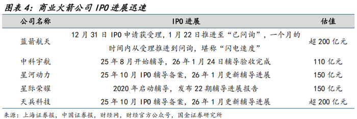 蓝箭航天IPO在12月31日申请获受理、1月22日完成第一轮问询,堪称“闪电速度”;中科宇航于26年1月17日完成上市辅导,商业火箭公司IPO进展推进有望带来产能放量。