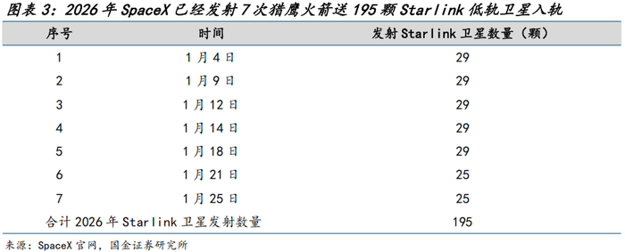美国星链持续扩容,发射紧锣密鼓,国内低轨星座加速组网紧迫性强。1)星链持续扩容:1月9日美国联邦通信委员会(FCC)批准马斯克旗下的SpaceX现可额外运营7500颗第二代星链卫星,使其全球在轨二代卫星总数增至15000颗,同时豁免此前限制星链系统“覆盖重叠”和“容量增强”的相关要求。2)Starlink卫星发射持续不断:截至1月29日,2026年SpaceX已经发射7次猎鹰火箭,共运载195颗低轨卫星入轨。根据国际电信联盟(ITU)的规定,卫星频率及轨道使用的规则是“先登先占、先占永得”,Starlink星座布局高速推进,有望倒逼国内低轨卫星加速组网。