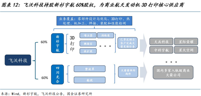 飞沃科技持股新杉宇航60%股权,为商业航天发动机3D打印核心供应商。公司通过持股新杉宇航涉足商业航天发动机3D打印业务:1)产品:新杉宇航是国内最早从事航天火箭发动机核心部件3D打印服务的企业之一,其核心产品包括喷注器、燃烧室、收扩段、扩张段、涡轮泵;2)头部客户覆盖:公司客户覆盖天兵科技、中科宇航、星际荣耀、星火空间等多家国内头部的商业航天火箭公司。