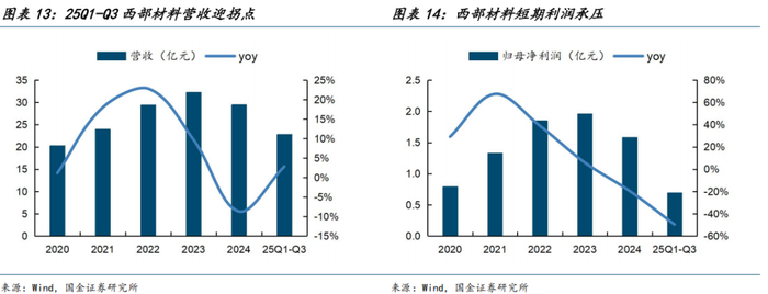 西部材料是从事稀有金属材料研发制造的领军企业,拥有钛合金、稀贵、钽铌金属材料等,产品覆盖航空航天、核电、环保、电力等行业。25Q1-Q3西部材料营收保持稳健,利润同比下滑主要是因为钛业、PTA、环保领域产品竞争激烈,价格下降以及产量下降导致规模不经济。
