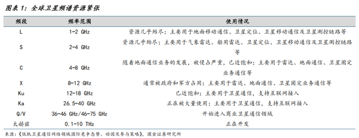 优质频率资源紧张,锁定频谱资源紧迫性增强。根据《低轨卫星通信网络领域国际竞争态势、动因及参与策略》,能够单独使用,实现全球覆盖的L、S、C频段资源几乎被占完,目前集中使用的Ku、Ka频段也是GEO宽带卫星的主要频率,同时星座之间还需要留出一定频率间隔防止相互干扰,协调难度大,锁定频谱资源的紧迫性强。