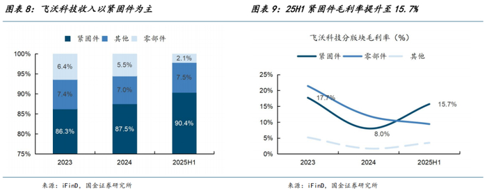 飞沃科技收入以紧固件为主,受益风电行业景气度上行,25H1毛利率提升至15.7%。25H1飞沃科技收入中紧固件占比达90.4%,得益于风电下游客户需求旺盛带来的销售量增长,叠加产品销售价格提升及单位成本下降,毛利率提升至15.7%,相对24年提升7.7pct。