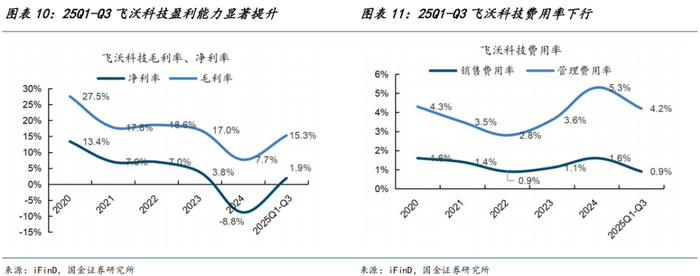 25Q1-Q3飞沃科技费用率下行,盈利能力显著提升。营收规模的增长,带来固定成本均摊降低,规模效应显现带动公司销售费用率、管理费用率下行,25Q1-Q3飞沃科技销售费用率、管理费用率为4.2%、0.9%,相对24年降低1.1pct、0.7pct。费用率下行叠加产品销售价格提升,飞沃科技25Q1-Q3净利率提升至1.9%,相对24年提升10.7pct。