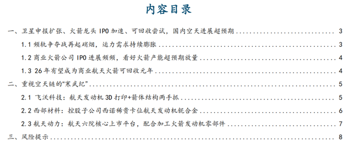 下游:上市公司进展加速,中美共振,解决运力卡点。1)争夺轨道资源:频轨争夺战再起硝烟,运力需求持续膨胀。根据《低轨卫星通信网络领域国际竞争态势、动因及参与策略》,能够单独使用、实现全球覆盖的L、S、C频段资源几乎被占完。截至1月29日,2026年SpaceX已经发射7次猎鹰火箭,共运载195颗低轨卫星入轨,抢占卫星频轨紧迫性强,运力需求持续膨胀,上市公司推进国内产业链进程加速至关重要。2)上市节奏加速:商业火箭公司IPO进展频频,看好火箭产能超预期放量。蓝箭航天IPO在25年12月31日申请获受理、1月22日完成第一轮问询,堪称“闪电速度”;中科宇航于26年1月17日完成上市辅导,星河动力、星际荣耀、天兵科技均在1月份更新IPO辅导进展,商业火箭公司IPO推进有望带来火箭产能放量。