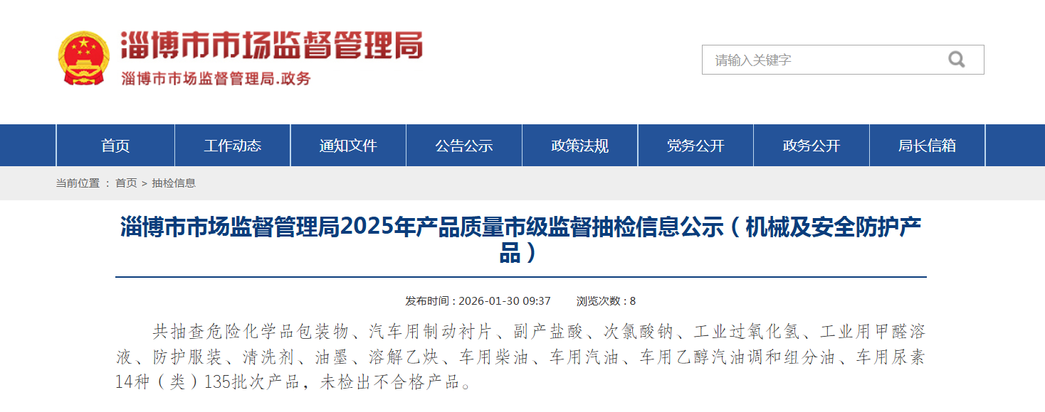 中国质量新闻网讯 近日,山东省淄博市市场监督管理局网站发布2025年产品质量市级监督抽检结果(机械及安全防护产品)。